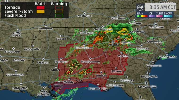 An outbreak of severe thunderstorms has begun. Some of the same areas hit by severe weather Monday are in Wednesday's threat area. Tornadoes, damaging winds, flooding rain and hail are all possible. Some tornadoes may be strong in the Southeast Wednesday. Severe storms are also expected along the East Coast Thursday. Another dangerous severe weather outbreak is underway, including the threat of strong tornadoes, in some of the same areas hit by severe thunderstorms and tornadoes Monday in the Southeast A tornado watch is in effect until noon CDT for a swath of the Southeast, from the northern Gulf Coast to western Georgia, including Atlanta, Birmingham, Mobile and Pensacola. Hail up to 2.5 inch diamter - just smaller than a baseball - was observed near Clayton, Alabama, just before 2:30 a.m. CDT. Ladonia and Crawford, Alabama, reported hail up to golfball size before 4 a.m. CDT. Current Radar with Watches, Warnings